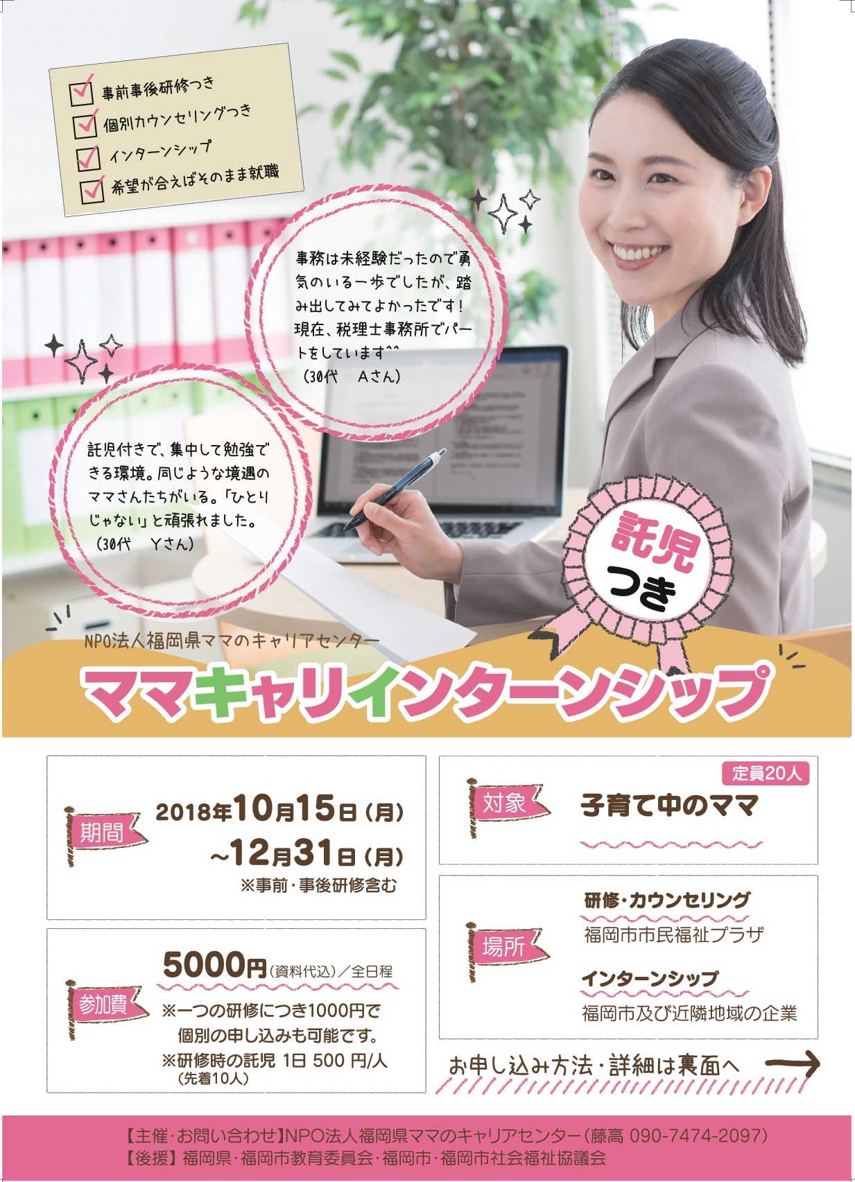 再就職やキャリアアップを目指す子育てママ向けの研修+インターンシップです。双方の希望が合えばインターン後に就職も可能です。(協力:ステア総合研究所 40-ユ-300791)