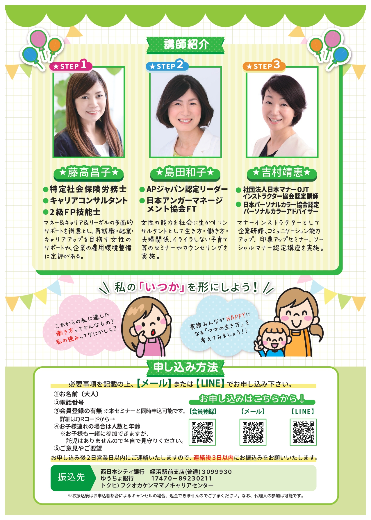 下記必要事項を記載の上、メールまたはLINEでお申込みください。<必要事項>